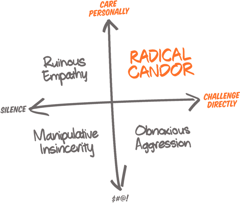 Radical Candor เป็นหนังสือที่โด่งดังเล่มหนึ่งเลย เขียนโดย Kim Scott ที่เคยเป็นผู้บริหารทั้งที่ Google และ Apple เล่มนี้ได้สอน framework การเป็นหัวหน้าสมัยใหม่ที่เน้นการพูดคุย feedback อย่างจริงใจกับลูกน้องซึ่งจะช่วยให้ทีมและองค์กรได้ผลลัพธ์ที่ต้องการอีกด้วย